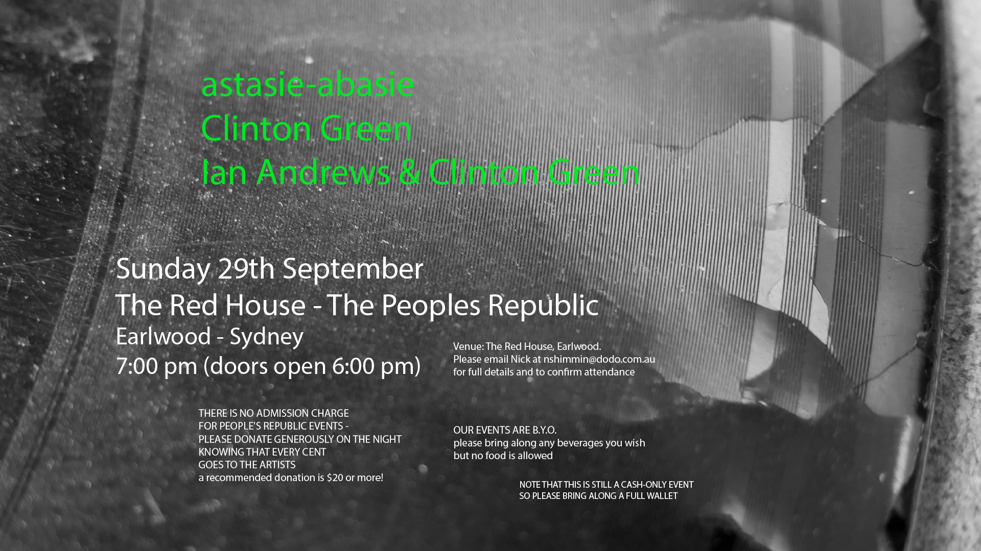 Email nshimmin@dodo.com.au for full details and to confirm attendance. Recommended donation of $20 or more, cash only.